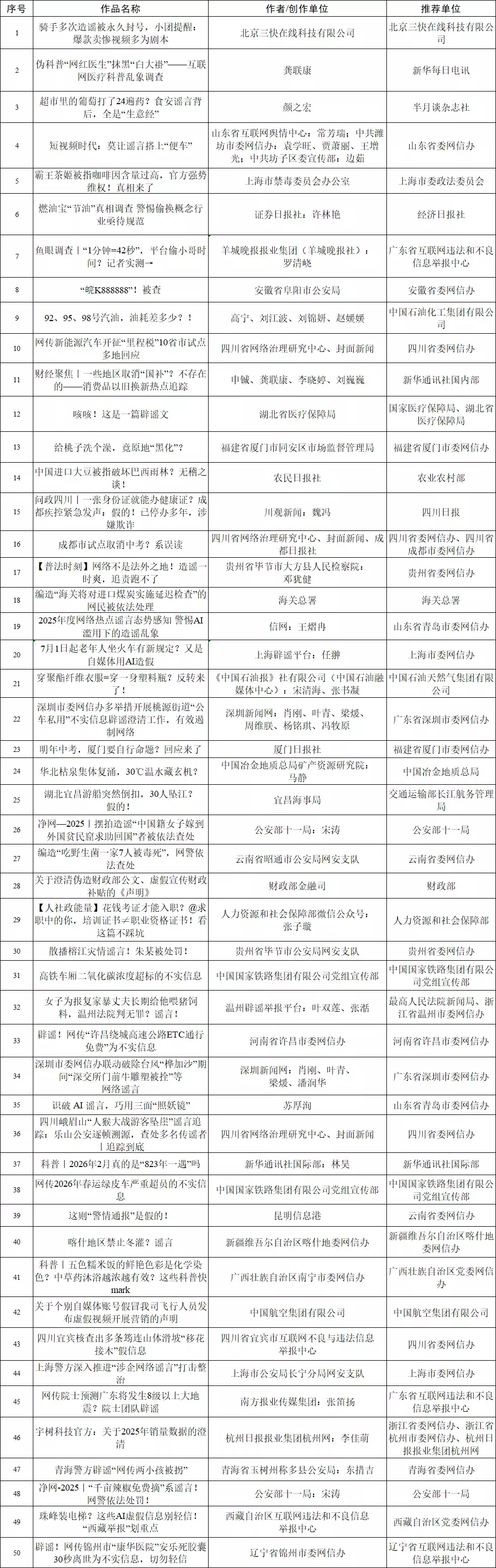 经过评审委员会严肃认真的初审,200部作品凭借扎实权威的辟谣、精良专业的制作、鲜活生动的表达和广泛传播的社会影响成功进入复审环节。其中,文字类50部、图片类50部、动漫音视频类60部、专题专栏类20部、优秀辟谣平台(账号)类20部。后续将经过复审和综合评定,最终从中产生70部优秀作品(平台/账号),在5月下旬举行的2026年中国网络文明大会网络辟谣论坛上正式发布。