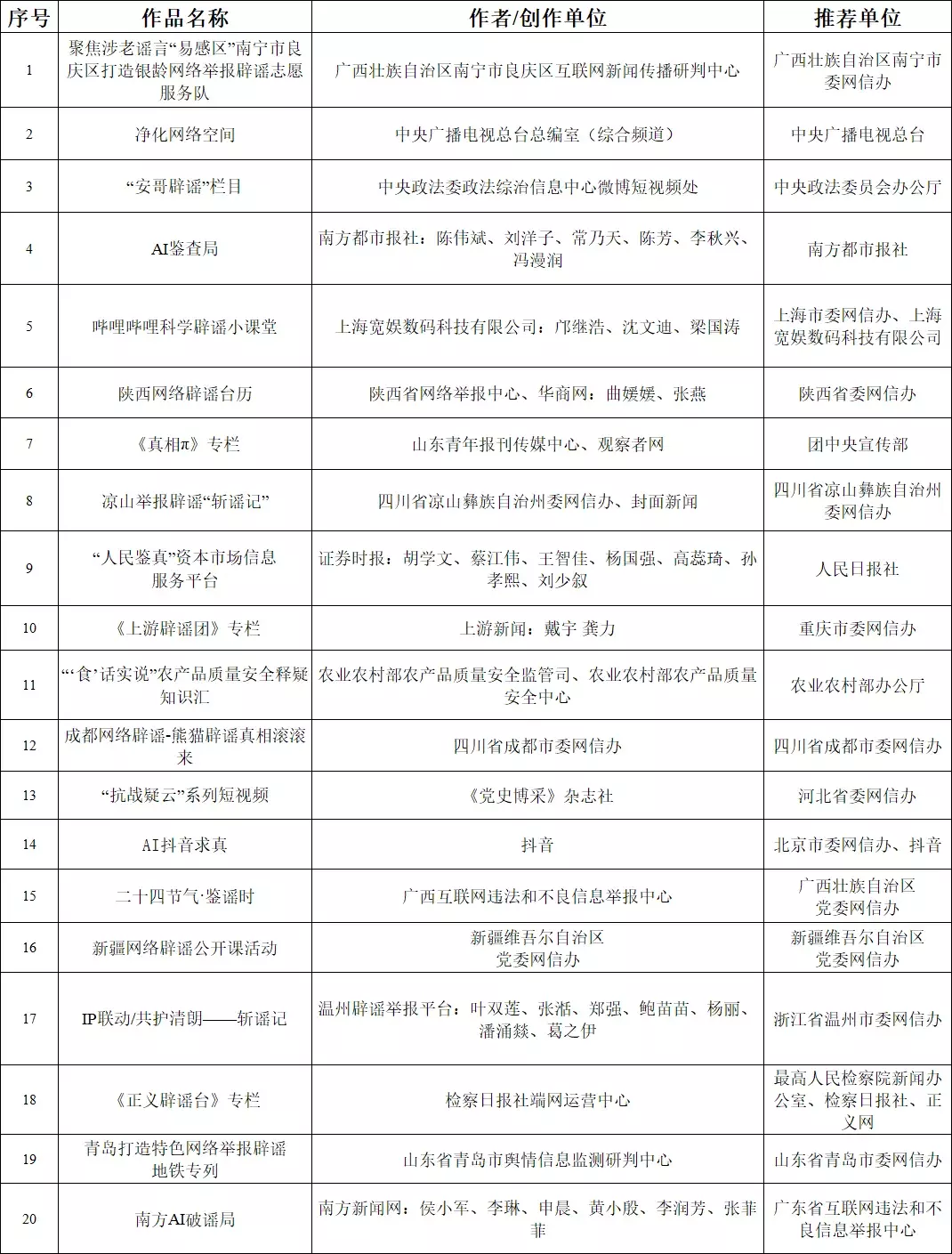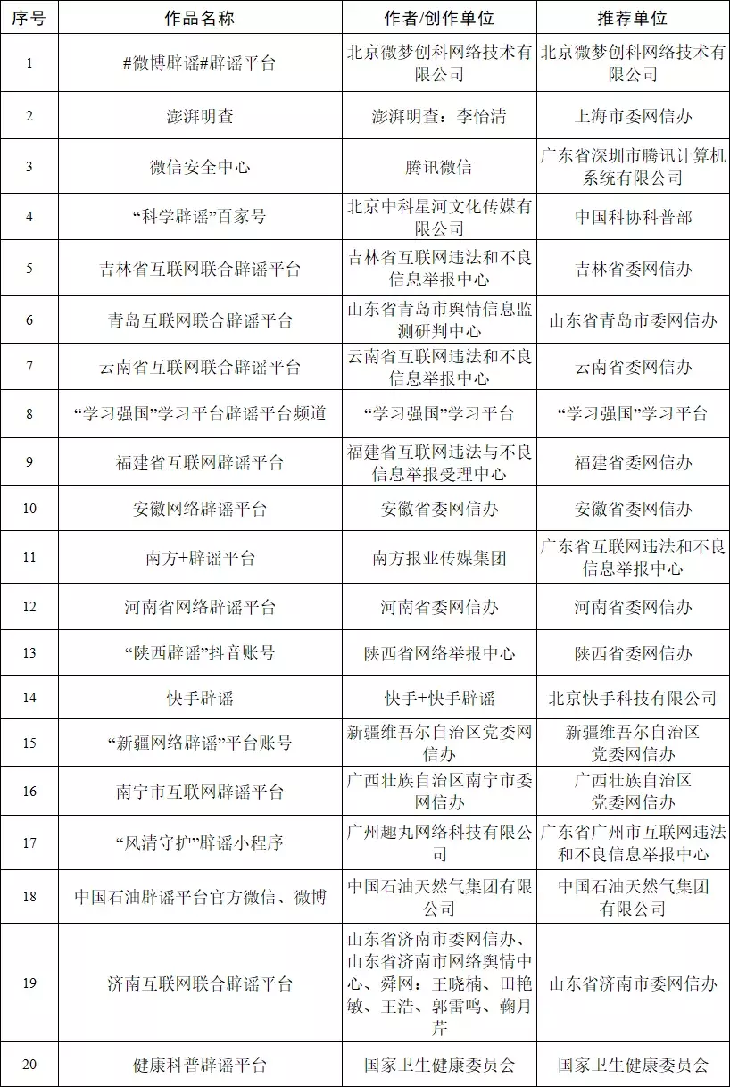 优秀辟谣平台(账号)类复审作品名单(20部)