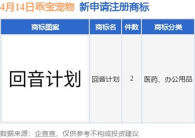 证券之星消息,根据天眼查APP数据显示,近日乖宝宠物食品集团股份有限公司新提交“回音计划”等2件商标注册申请。商标申请详情如下: