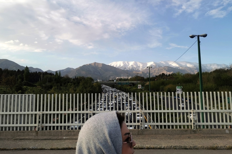 4月22日,一名女子在伊朗德黑兰北部的一座天桥上行走。新华社/法新