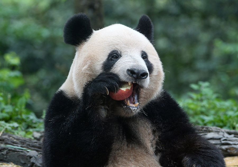 探访归国大熊猫“香香”的日常生活,咬起苹果咯嘣脆