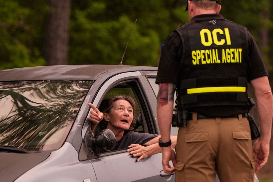 4月22日,美国佐治亚州,一名女子在火灾现场附近的路障处交谈。
