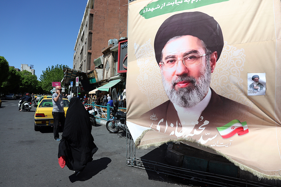 4月22日,伊朗德黑兰,一名伊朗女性走过街头哈梅内伊的海报。